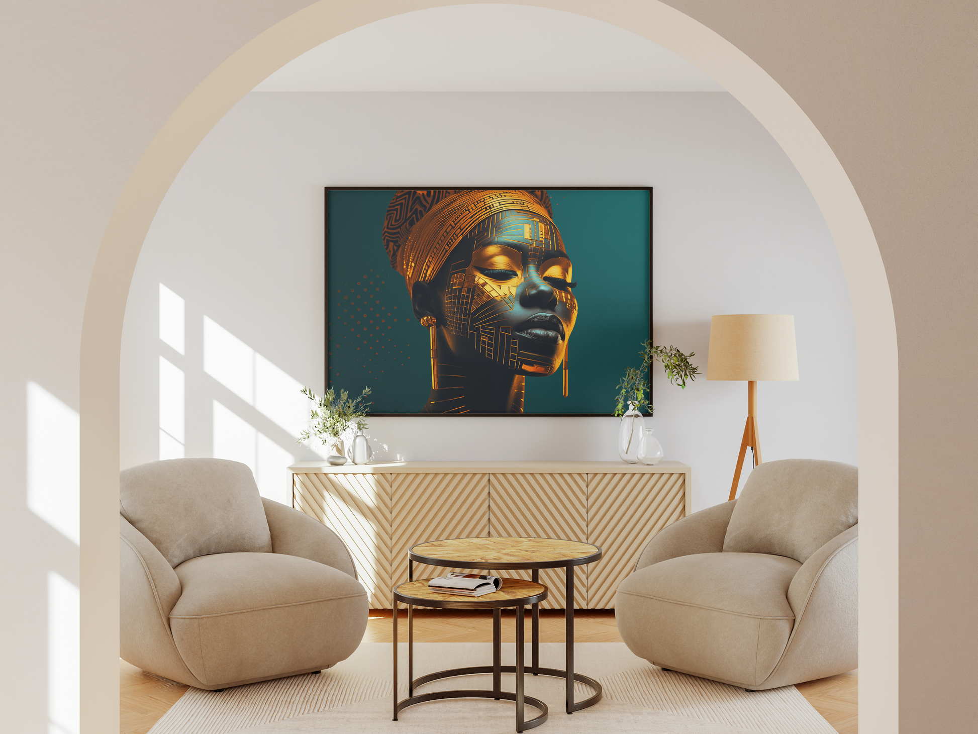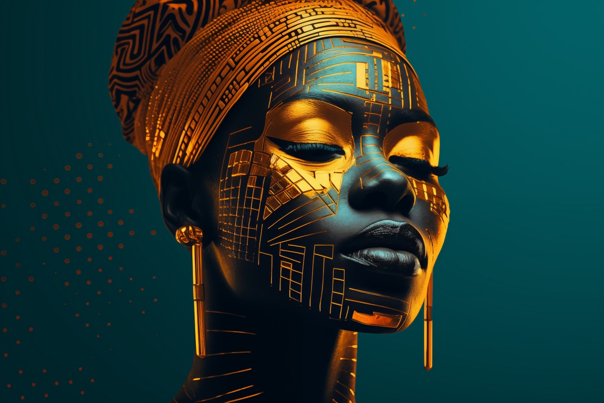"Nyaluak" is a celebration of individuality and tradition. This enchanting piece presents an intimate portrait, showcasing the up-close face of a dark-skinned Northern African girl adorned with golden paint. The delicate details in her expression and the golden accents create a striking harmony that encapsulates the beauty found in the diversity of Northern and Eastern African cultures.